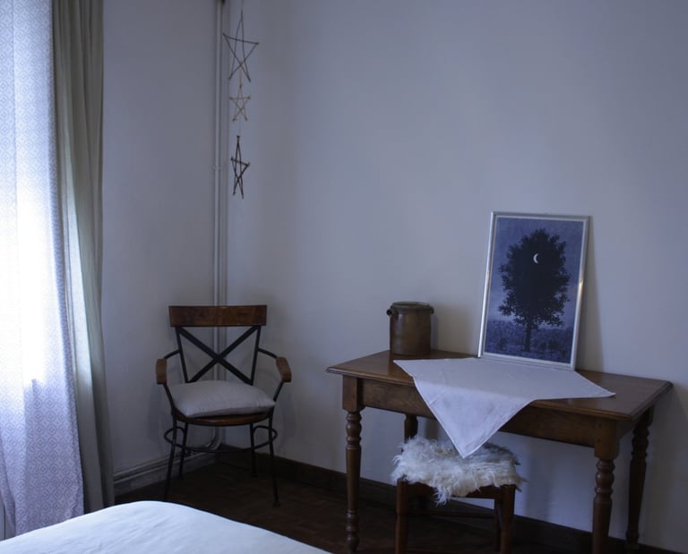 Je loue une chambre avec un lit double dans ma maison. La salle-de-bains, toilettes et cuisine sont en commun. Les murs ont été peints à la peinture à la pomme de terre dans laquelle j'ai ajouté des pigments de terre d'ombre brûlée. Le plafond est quant à lui peint à la peinture à la farine. Cette chambre paisible donne sur la cour et est isolée du reste de la maison par un petit couloir et deux portes. Mes locataires y sont au calme.